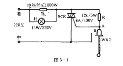 圖3—1所示電路。由一只雙向可控硅,一個電阻和一支水銀觸點溫度計共三個元件構成溫控器。其工作原理也很簡單:當被加熱物體的溫度低于由水銀觸點溫度計設定值時,A、B點斷開,SCR