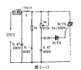 圖2-11電路簡單實用經濟。可以用作調速、調溫等多種用途。該電路的工作原理是常規的阻容移相觸發可控硅,使可控硅的導通角改變以調節負載電流,使相應的負載功能得到調節。調節W即可控制3CTS