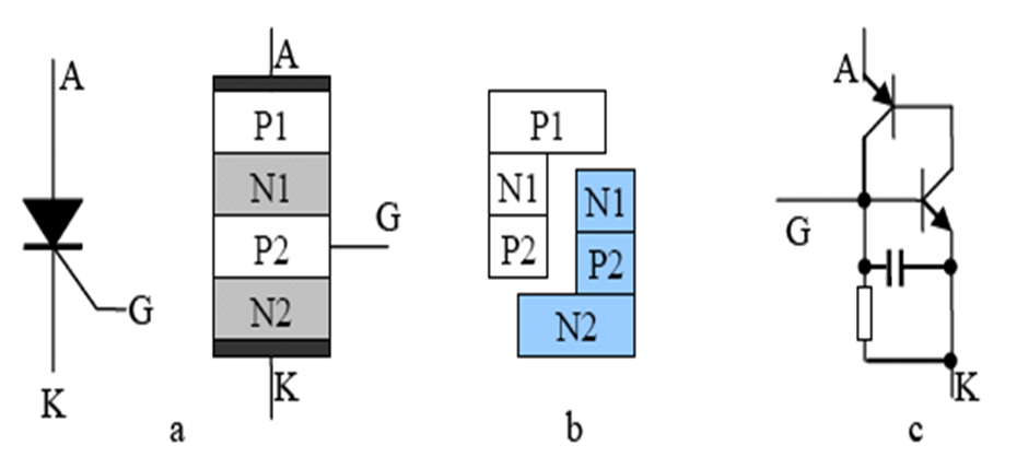 它是由PNPN四層半導構成,有三個PN結、有三個電極(陽極A、陰極K和控制極G)。