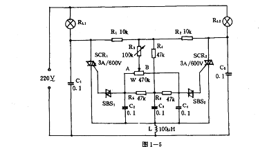 調光電路如圖1—5所示。本電路由R4、C3、L為對稱軸的兩個調光電路構成調節w就可使一個燈逐漸變亮,而同時另一個燈逐漸變暗。但兩燈發光總亮度之和是不變的。這種電路在某些場合有用。