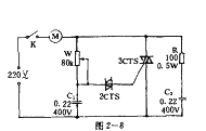圖2-8電路控制電機轉速的原理是:閉合開關K,電網交流電向C1充電至使2CTS導通,從而觸發雙向可控硅3CTS導通。導通角由電位器W控制。電機也就隨著通過