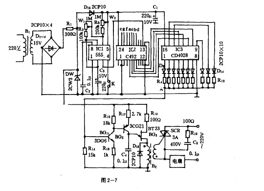 在圖2-7所示的電路中,降壓整流穩壓后得到約lOV直流電壓。ICl(555)等組成無穩