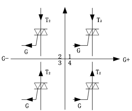 雙向可控硅有四個工作象限,在實際工作時只有兩個象限組合成一個完整的工作周期。組合如下:Ⅰ-Ⅲ、Ⅱ-Ⅲ、Ⅰ-Ⅳ,沒有Ⅰ-Ⅱ 、Ⅱ-Ⅳ、Ⅲ-Ⅳ組合