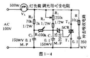 圖1一4所示的電路,是一種無滯后寬范圍的調(diào)光電路。它的調(diào)光原理是調(diào)節(jié)R1改變C1的充電時間使SCR可控硅的導(dǎo)通角改變。用R2,C2拓寬控制范圍。調(diào)節(jié)良R3(R1調(diào)至最大時)整定在SCR開通的臨界點。本電路調(diào)壓范圍約在5~95%之間。