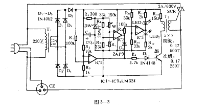 圖3—3采用過零觸發(fā)可控硅的控溫電路。它對(duì)電源干擾很小。ICl、BG及T2組成過零觸發(fā)電路。整流后的脈動(dòng)電流輸入ICl反相輸入端,在電流過零時(shí)ICl輸出一個(gè)電脈沖到BG的基極。這時(shí)BG飽和導(dǎo)通,其余時(shí)間BG截止。在T2次級(jí)產(chǎn)生一個(gè)脈沖觸發(fā)雙向可控硅導(dǎo)通。IC2、R6、R7、W、R1;組成溫度控制電路。被控溫度低于設(shè)定溫度時(shí),IC2輸出高電平,D6反偏截止,不影響觸發(fā)電路。當(dāng)溫度升高使IC2輸出低電平時(shí),D6導(dǎo)通。待電源過零后,由于t2時(shí)刻脈沖被D6短路,SCR可控硅關(guān)斷。隨溫度下降,R4阻值增大。IC2輸出高電平(ty時(shí)刻),但被D6反偏而阻斷。只有待到t4。時(shí)刻ICl輸出脈沖時(shí),SCR可控硅被觸發(fā)導(dǎo)通。從而實(shí)現(xiàn)過零開關(guān)進(jìn)行溫度控制。