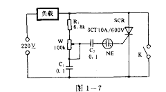 圖1一7中閉合K時,調壓電路不起作用。這時負載得到全功率。斷開K時,負載所得功率被SCR單向可控硅調壓電路控制。調節W可改變C1的充電時間.也就改變SCR