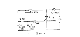 圖1—29是一個線路簡單,經(jīng)濟價廉的調光電路。接上電源,雙向可控硅未能導通。當電器C2充電至氖燈點亮時,有電流通過雙向可控硅3CTS的控制極,使3CTS雙向可控硅導通。3CTS的導通角由W控制。